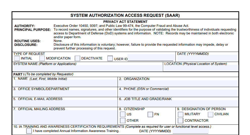 I hold a reserve assignment with an active duty component, and am required to complete a travel authorization form for personal travel abroad. The form contains personally identifiable information, including my Social Security number. I was sent two forms and a mandatory training — a PowerPoint reminding people not to do obviously irresponsible things — and one of the forms required a supervisor signature.